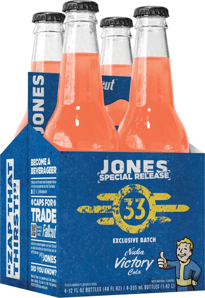 FRESH 12oz glass bottles Jones Fallout Nuka Victory Cola soda made of course with PURE CANE SUGAR – LIMITED EDITION!! Based on one of the greatest video game series of all time, Fallout is the story of haves and have-nots in a world in which there’s almost nothing left to have. 200 years after the apocalypse, the gentle denizens of luxury fallout shelters are forced to return to the irradiated hellscape their ancestors left behind — and are shocked to discover an incredibly complex, gleefully weird and highly violent universe waiting for them. Whether you’re facing off against wastelanders or wandering the post-apocalyptic ruins, you’ll need a tasty refreshment to keep you going. Enter Nuka-Cola Victory! This bright, reddish-orange soda is the ultimate thirst-quencher for any Fallout fanatic. The flavor is described as peach-mango.
